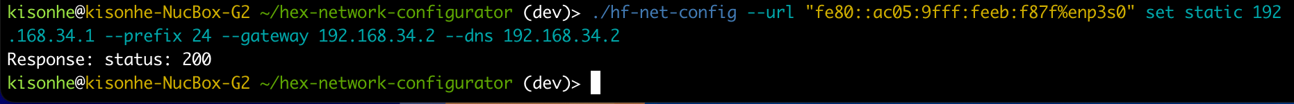 ./hf-net-config --url fe80::500d:96ff:fee1:d60b%enp3s0 set static 192.168.34.1 --prefix 24 --gateway 192.168.34.2 --dns 192.168.34.2
