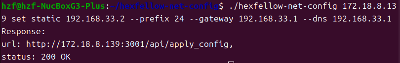 ./hexfellow-net-config 172.18.8.139 set static 192.168.33.2 --prefix 24 --gateway 192.168.33.1 --dns 192.168.33.1