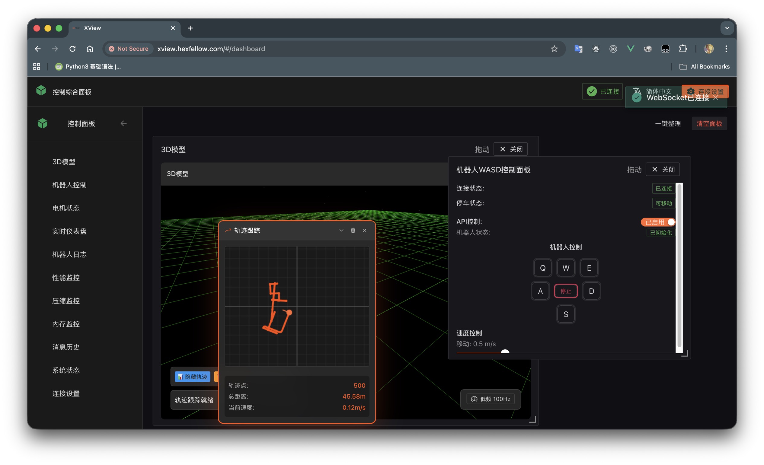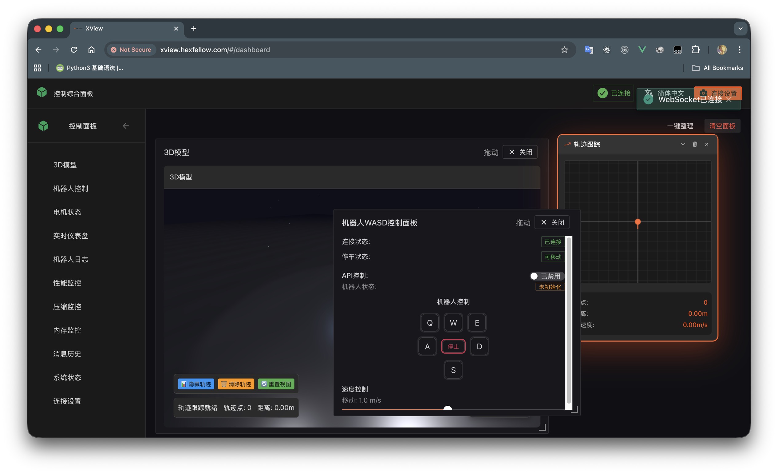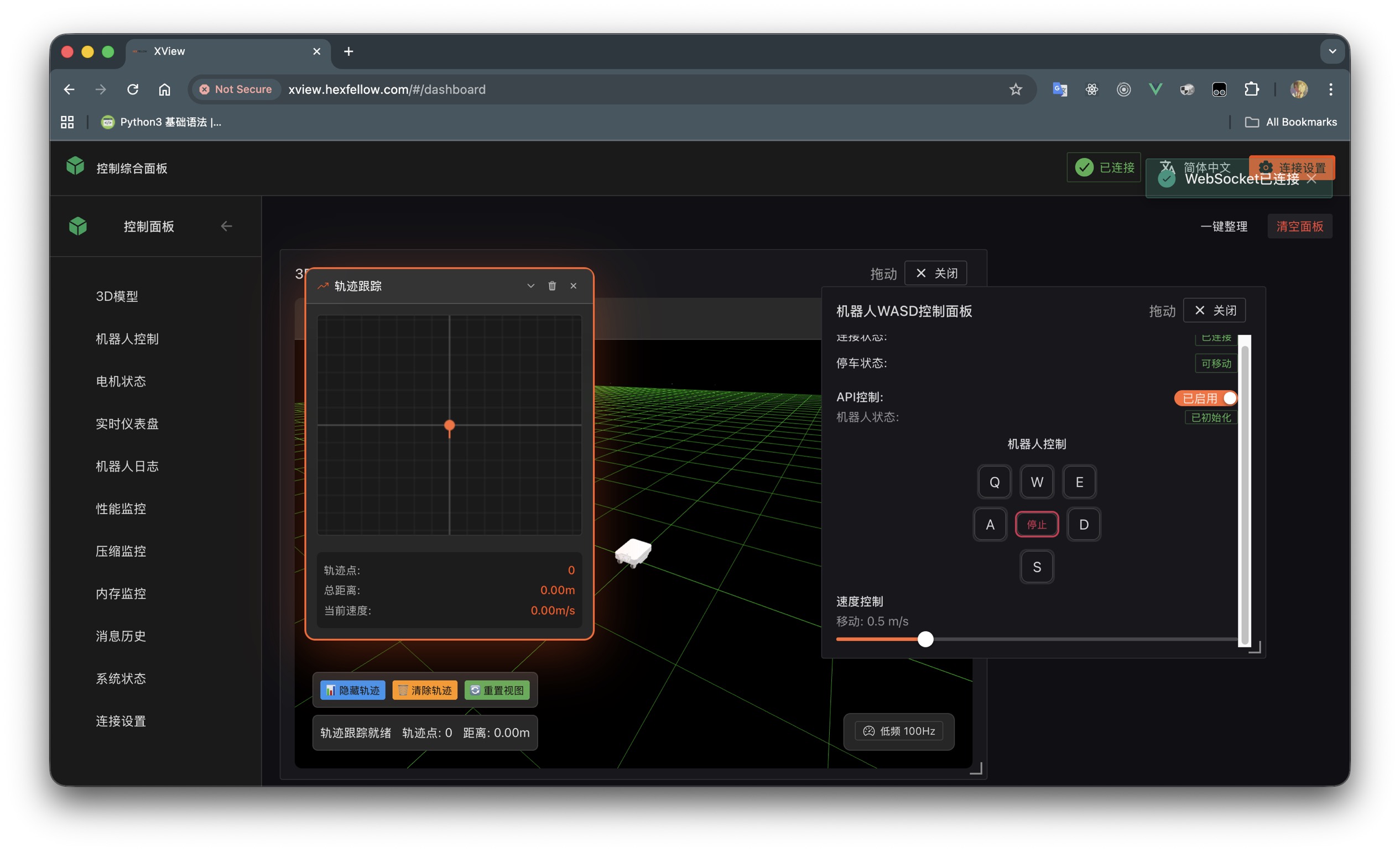 API Controlswitch, and you can now press WSADQE to move the chassis. Again, XView is only for testing purposes. Due to JavaScript performance limitations and other reasons, even if the selected chassis supports multi-directional movement, XView does not support sending such instructions. If you need multi-directional movement, please use API control.
